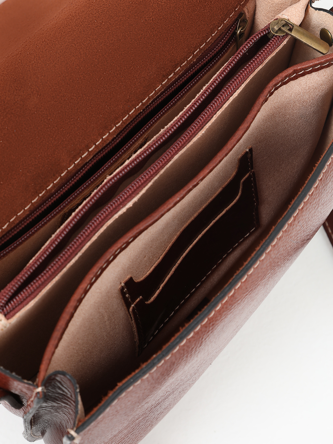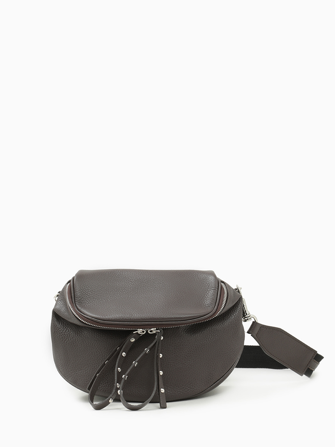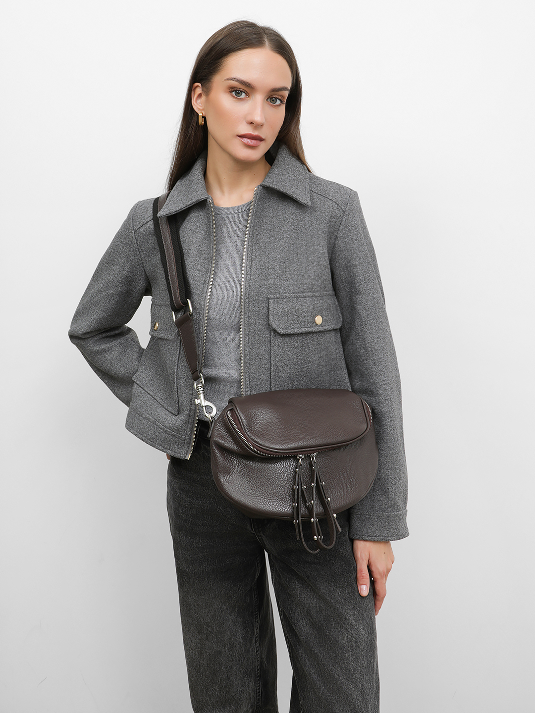 Полукруглая мягкая кросс-боди с длинными кожаными пуллерами с клёпками от FOLLE в коричневом цвете